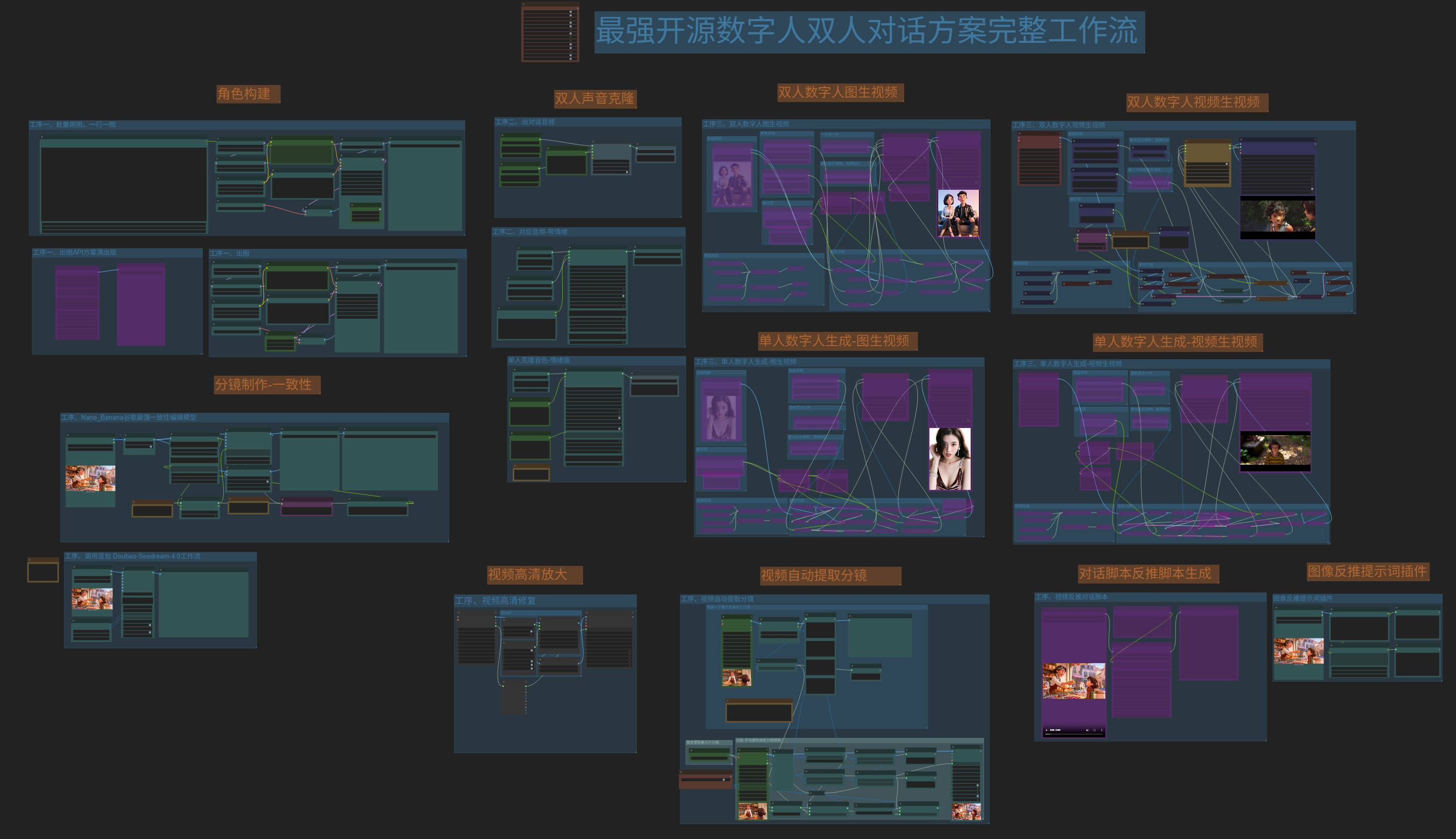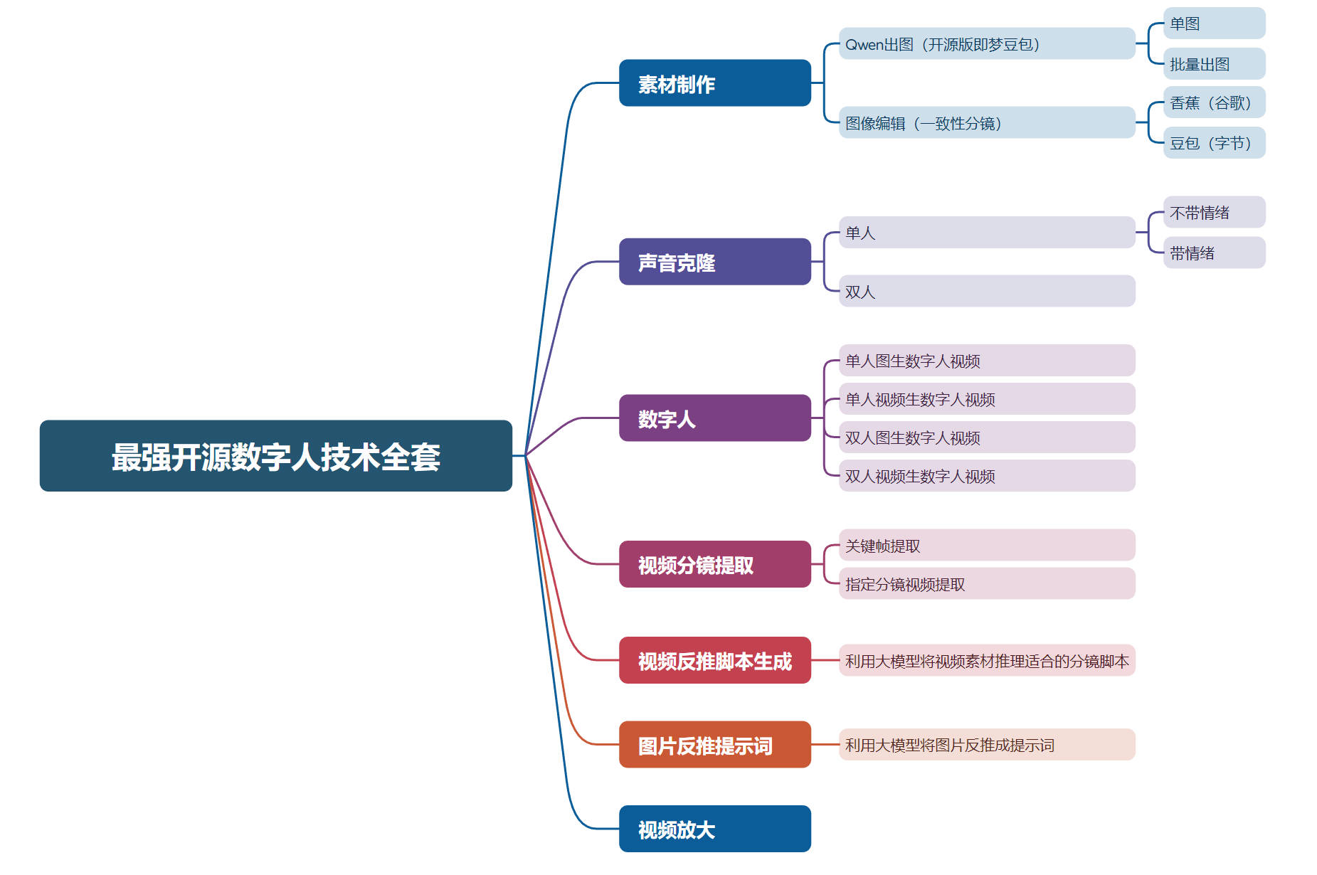 从图片素材的制作、到一致性改图、到声音克隆、四种数字人技术、视频分镜提取、视频反推脚本、图片反推提示词、视频放大,方方面面都考虑到了。